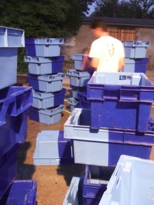 Soit en caisses. L’enjambeur, sur lequel est fixé deux plateaux, se positionne devant les vendangeurs. Un membre de l’équipe réceptionne les seaux de chacun et les passe à ceux qui sont sur les plateaux. Ils transvasent le raisin dans les caisses, puis les caisses sont chargées dans les camions, direction le chai!